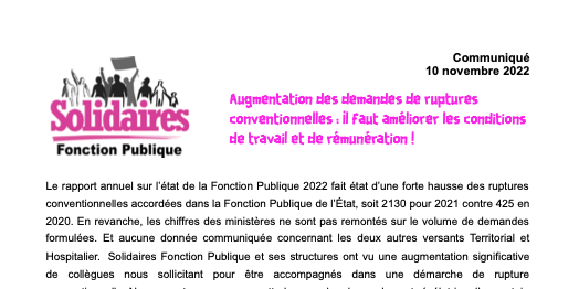 Le rapport annuel sur l’état de la Fonction Publique 2022 fait état d’une forte hausse des ruptures conventionnelles accordées dans la Fonction Publique de l’État, soit 2130 pour 2021 contre 425 en 2020. En revanche, les chiffres des ministères ne sont pas remontés sur le volume de demandes formulées. Et aucune donnée communiquée concernant les deux autres versants Territorial et Hospitalier. Solidaires Fonction Publique et ses structures ont vu une augmentation significative de collègues nous sollicitant pour être accompagnés dans une démarche de rupture conventionnelle.