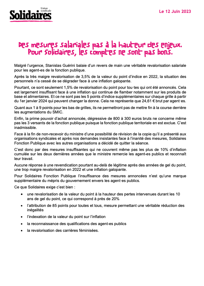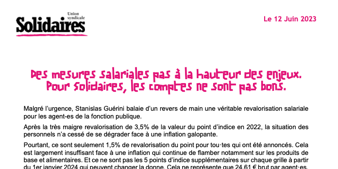 C’est donc par des mesures insuffisantes qui ne couvrent même pas les plus de 10% d’inflation cumulée sur les deux dernières années que le ministre remercie les agent-es publics et reconnaît leur travail.