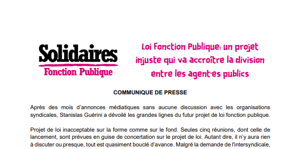 Solidaires Fonction Publique demande le retrait de ce chantier qui doit aboutir à un projet de loi délétère pour la carrière et les conditions d’exercice des agent·es. Nous nous inscrirons avec force dans les nécessaires mobilisations à venir, dans l’unité et la détermination.
