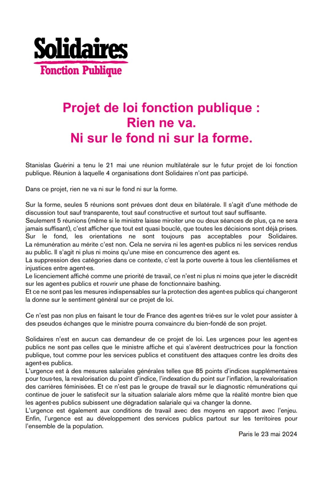 Solidaires n’est en aucun cas demandeur de ce projet de loi. Les urgences pour les agent·es publics ne sont pas celles que le ministre affiche et qui s’avèrent destructrices pour la fonction publique, tout comme pour les services publics et constituent des attaques contre les droits des agent·es publics.
