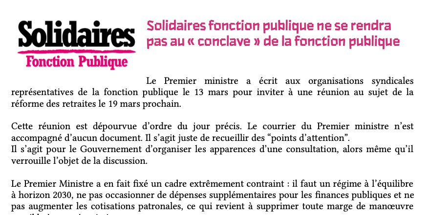 Le Premier ministre a écrit aux organisations syndicales représentatives de la fonction publique le 13 mars pour inviter à une réunion au sujet de la réforme des retraites le 19 mars prochain.