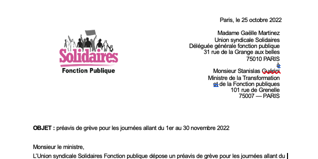 L’Union syndicale Solidaires Fonction publique dépose un préavis de grève pour les journées allant du 1er au 30 novembre 2022 (de 0 h à 24 h).