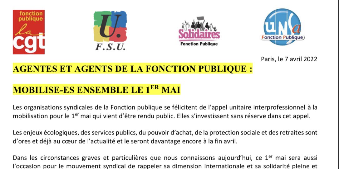 Les organisations syndicales de la Fonction publique se félicitent de l’appel unitaire interprofessionnel à la mobilisation pour le 1er mai qui vient d’être rendu public. Elles s’investissent sans réserve dans cet appel.