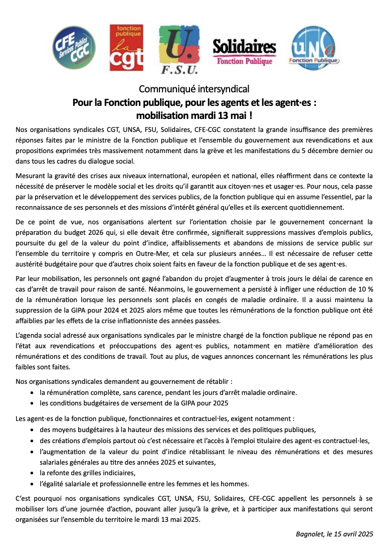 C’est pourquoi nos organisations syndicales CGT, UNSA, FSU, Solidaires, CFE-CGC appellent les personnels à se mobiliser lors d’une journée d’action, pouvant aller jusqu’à la grève, et à participer aux manifestations qui seront organisées sur l’ensemble du territoire le mardi 13 mai 2025.