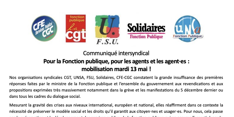 Pour la Fonction publique, pour les agents et les agent·es : mobilisation mardi 13 mai !