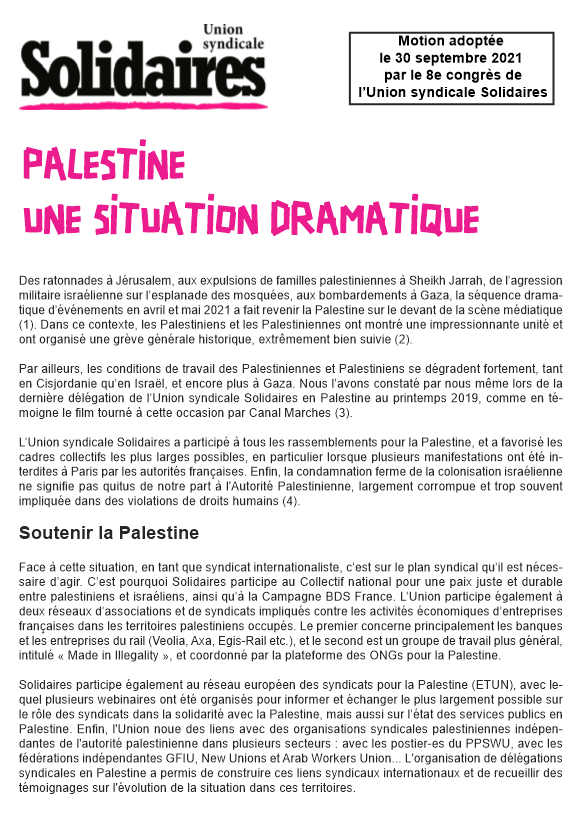 L’Union syndicale Solidaires a participé à tous les rassemblements pour la Palestine, et a favorisé les cadres collectifs les plus larges possibles, en particulier lorsque plusieurs manifestations ont été interdites à Paris par les autorités françaises. Enfin, la condamnation ferme de la colonisation israélienne ne signifie pas quitus de notre part à l'Autorité Palestinienne, largement corrompue et trop souvent impliquée dans des violations de droits humains (4).