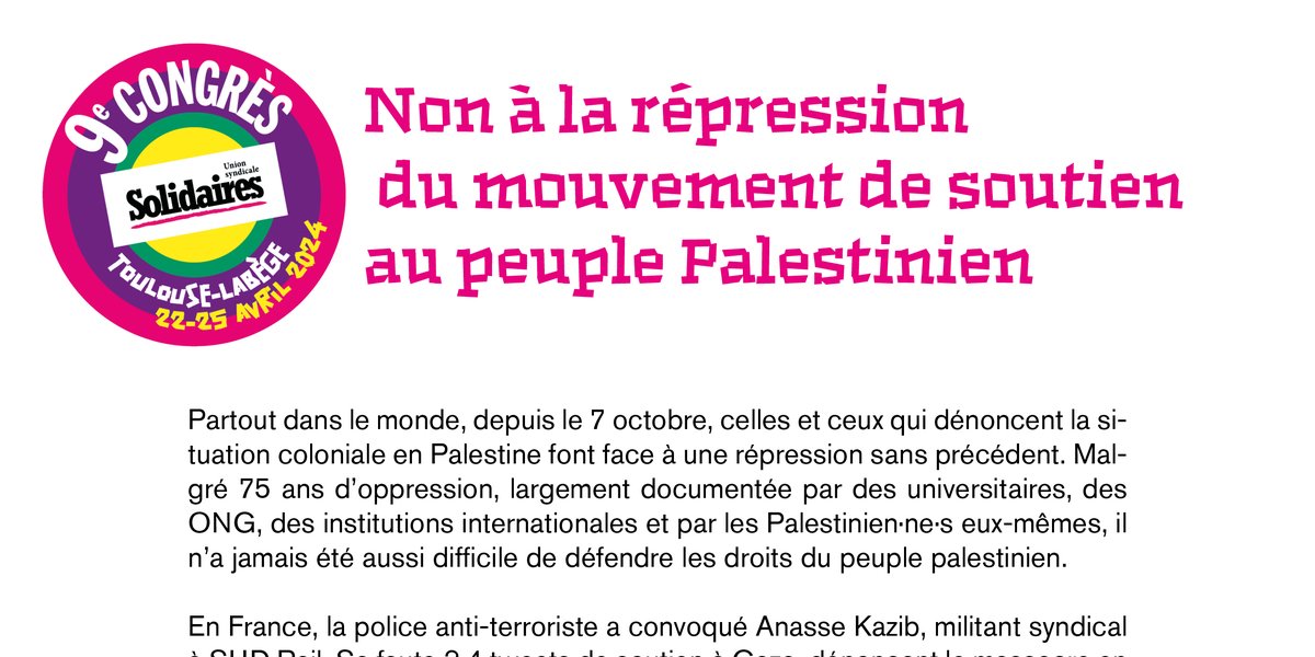 Les congressistes présent-e-s au congrès de l’Union syndicale Solidaires apportent le soutien à nos camarades et à l’ensemble des militants et militantes attaqués et appellent à faire front contre la répression.