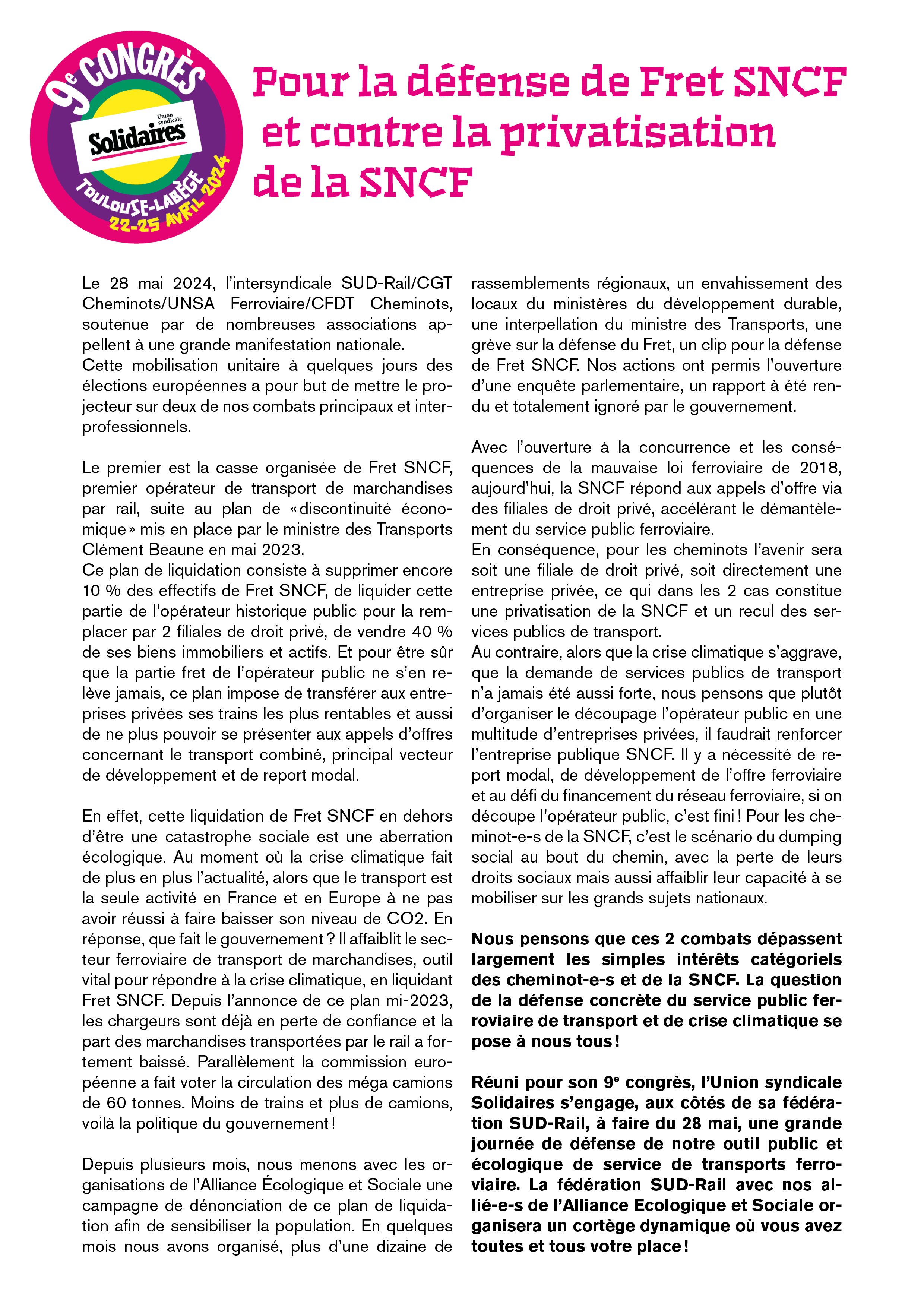 Réuni pour son 9e congrès, l’Union syndicale Solidaires s’engage, aux côtés de sa fédération SUD-Rail, à faire du 28 mai, une grande journée de défense de notre outil public et écologique de service de transports ferroviaire. La fédération SUD-Rail avec nos allié-e-s de l’Alliance Ecologique et Sociale organisera un cortège dynamique où vous avez toutes et tous votre place !