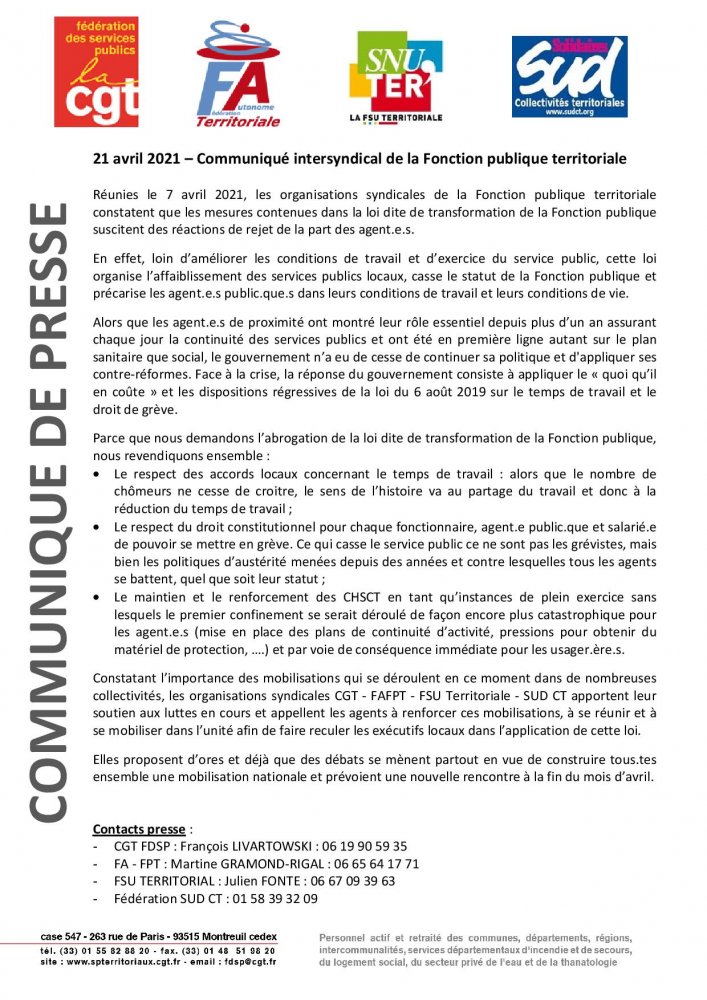 21 avril 2021 – Communiqué intersyndical de la Fonction publique territoriale
