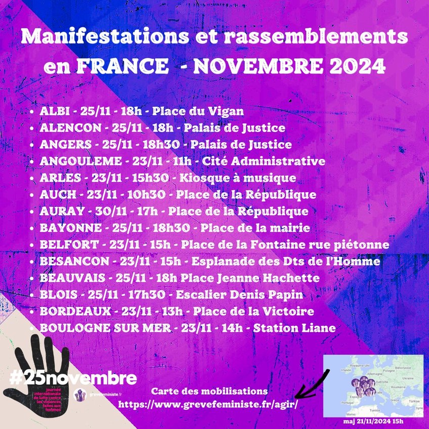 Les 23, 24 ou 25 novembre, dans les rues, partout en France et dans le monde, nous manifesterons pour dire Stop aux violences faites aux femmes ! Parce que tant qu'une seule d'entre nous subira des violences, qu'elles soient physiques, psychologiques, ou sexuelles, nous lutterons. De l'Iran au Mexique aux Etats-Unis, de l’Afghanistan à la Russie à la France, des femmes du monde entier luttent pour leur droit, pour une vie sans peur et sans violence.