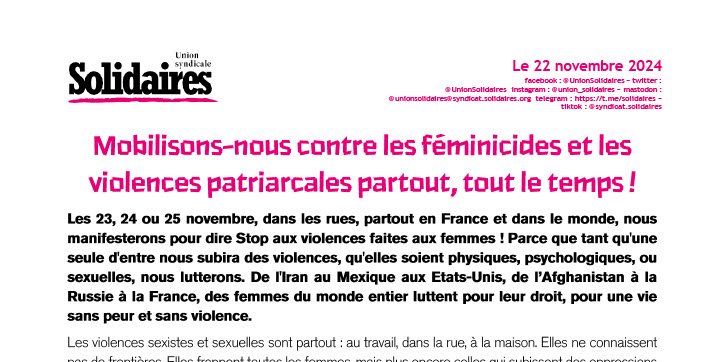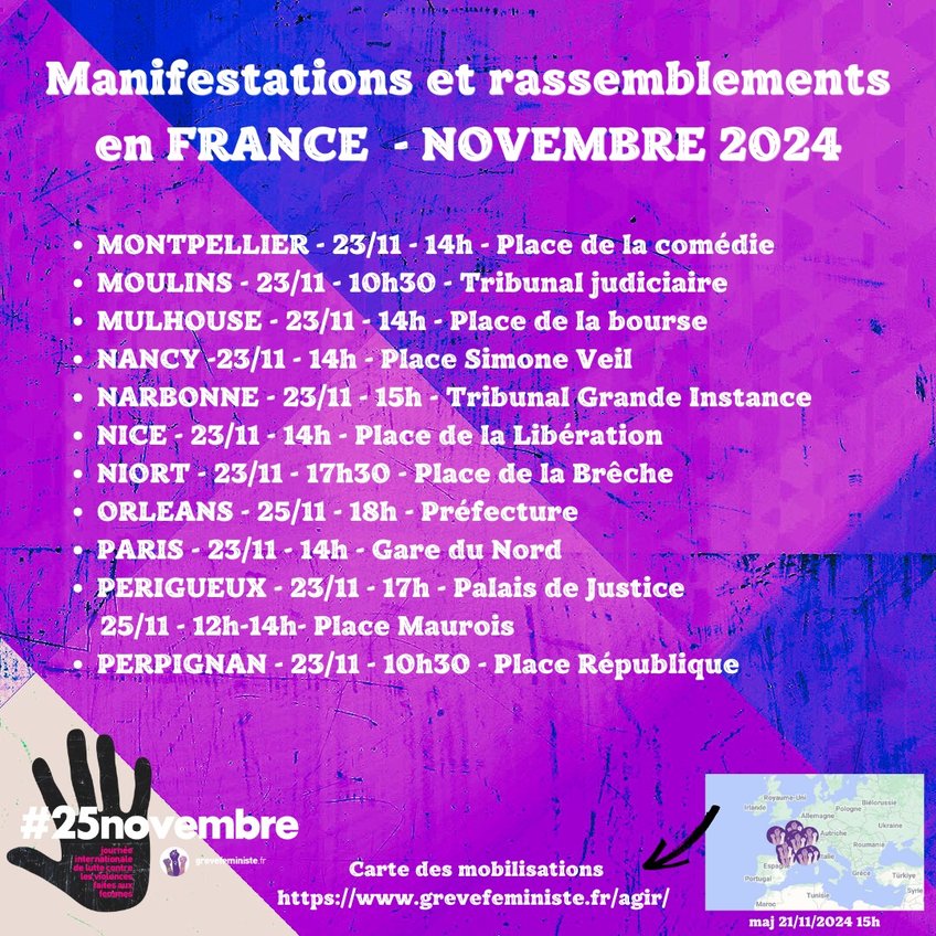 Les 23, 24 ou 25 novembre, dans les rues, partout en France et dans le monde, nous manifesterons pour dire Stop aux violences faites aux femmes ! Parce que tant qu'une seule d'entre nous subira des violences, qu'elles soient physiques, psychologiques, ou sexuelles, nous lutterons. De l'Iran au Mexique aux Etats-Unis, de l’Afghanistan à la Russie à la France, des femmes du monde entier luttent pour leur droit, pour une vie sans peur et sans violence.