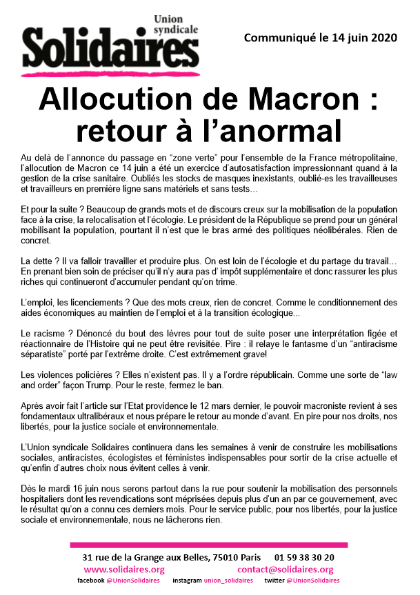 L’Union syndicale Solidaires continuera dans les semaines à venir de construire les mobilisations sociales, antiracistes, écologistes et féministes indispensables pour sortir de la crise actuelle et qu’enfin d’autres choix nous évitent celles à venir.