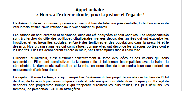 En rejetant Marine Le Pen, il s’agit d’empêcher l’avènement d’un projet de société destructeur de l’État de droit, de la république démocratique sociale et solidaire que nous défendons chaque jour. Il s’agit de dénoncer son programme trompeur qui frapperait durement les plus faibles, les plus démunis, les femmes, les personnes LGBTI ou étrangères.