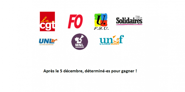 Les organisations syndicales CGT, FO, FSU, Solidaires, MNL, UNL et UNEF se félicitent de l’ampleur des mobilisations par la grève lancée ce 5 décembre et par la participation massive aux manifestations organisées partout dans le pays.