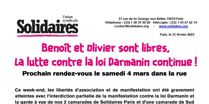 Benoît et Olivier sont membres de l’Union syndicale Solidaires et nous avons dénoncé ces privations de liberté scandaleuses. Leurs arrestations ont eu lieu dans le cadre de la lutte contre la loi Darmanin, à l’initiative du cadre unitaire “Uni-es contre l’immigration jetable, Pour une politique migratoire d’accueil !” (@UCIJ2023).