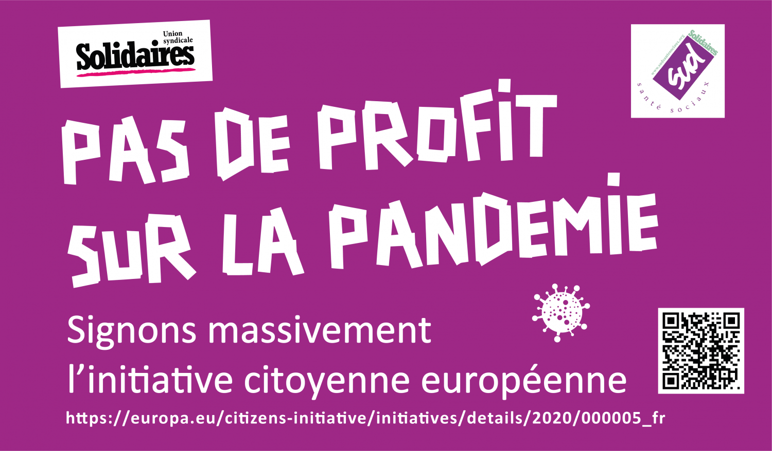 Dans le contexte de crise sanitaire qui se traduit aujourd’hui par une crise économique et sociale majeure, l’Union Syndicale SOLIDAIRES et la Fédération SUD Santé Sociaux, se sont jointes à l’Initiative Citoyenne Europeenne, « Pas de profits sur la pandémie » qui regroupe une coalition de syndicats de travailleurs, d'ONG, de groupes de militant.e.s, d'associations, de partis politiques et d'experts de la santé en France et en Europe.