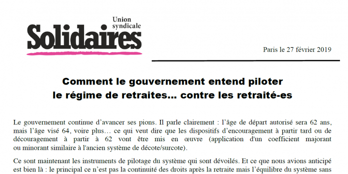 Ce sont maintenant les instruments de pilotage du système qui sont dévoilés. Et ce que nous avions anticipé est bien là : le principal ce n’est pas la continuité des droits après la retraite mais l’équilibre du système sans dépense supplémentaire. Pour Solidaires, le système doit s’équilibrer, mais cela veut dire qu’il doit être possible d’augmenter les cotisations, et les cotisations patronales en particulier, c’est ce que nous appelons une plus juste répartition des richesses.