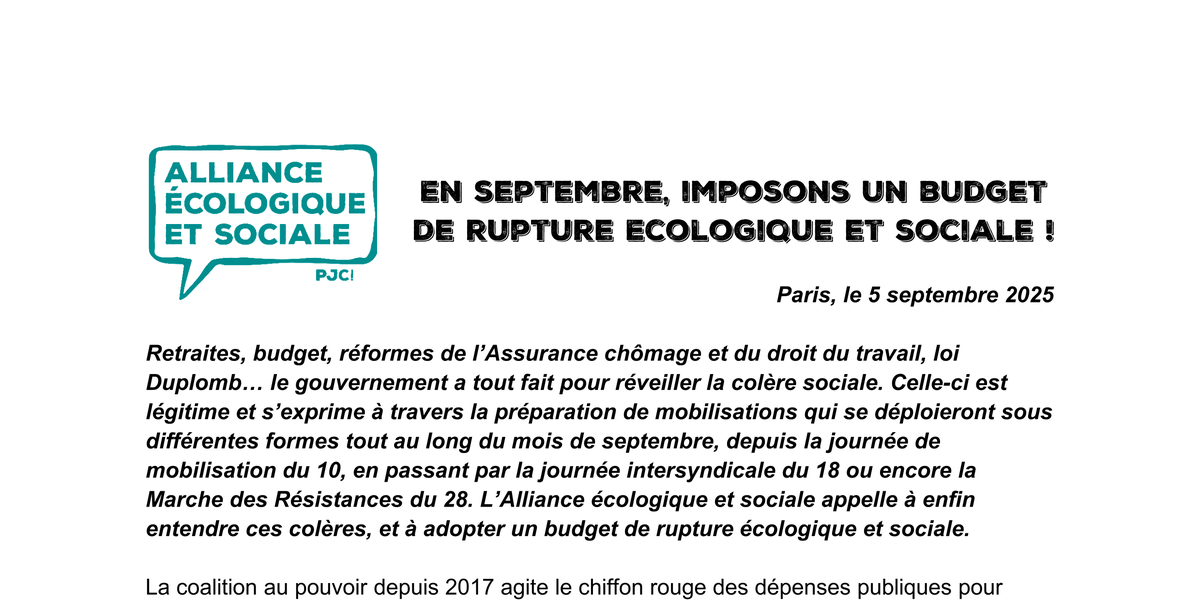 Retraites, budget, réformes de l’Assurance chômage et du droit du travail, loi Duplomb… le gouvernement a tout fait pour réveiller la colère sociale. Celle-ci est légitime et s’exprime à travers la préparation de mobilisations qui se déploieront sous différentes formes tout au long du mois de septembre, depuis la journée de mobilisation du 10, en passant par la journée intersyndicale du 18 ou encore la Marche des Résistances du 28. L’Alliance écologique et sociale appelle à enfin entendre ces colères, et à adopter un budget de rupture écologique et sociale.