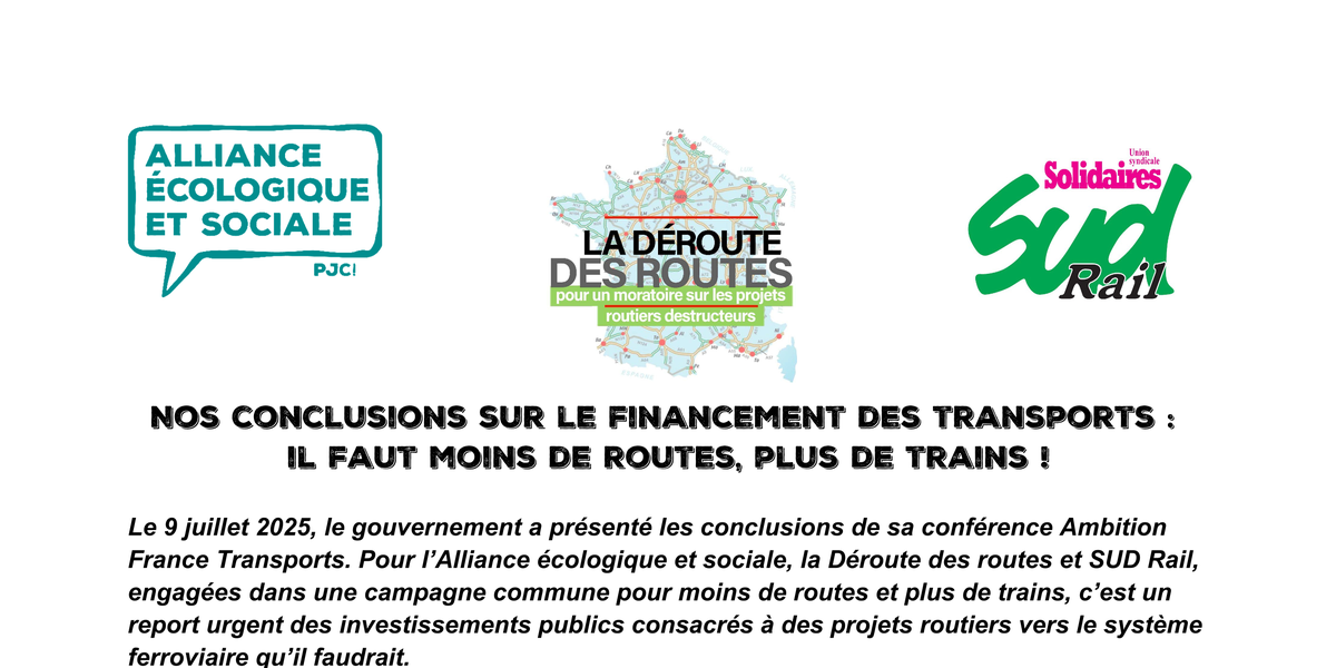 Le 9 juillet 2025, le gouvernement a présenté les conclusions de sa conférence Ambition France Transports. Pour l’Alliance écologique et sociale, la Déroute des routes et SUD Rail, engagées dans une campagne commune pour moins de routes et plus de trains, c’est un report urgent des investissements publics consacrés à des projets routiers vers le système ferroviaire qu’il faudrait.