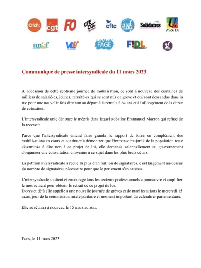 D'ores et déjà elle appelle à une nouvelle journée de grèves et de manifestations le mercredi 15 mars, jour de la commission mixte paritaire et moment important du calendrier parlementaire.
