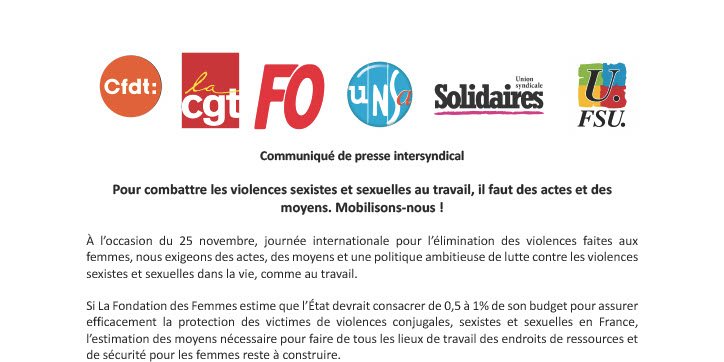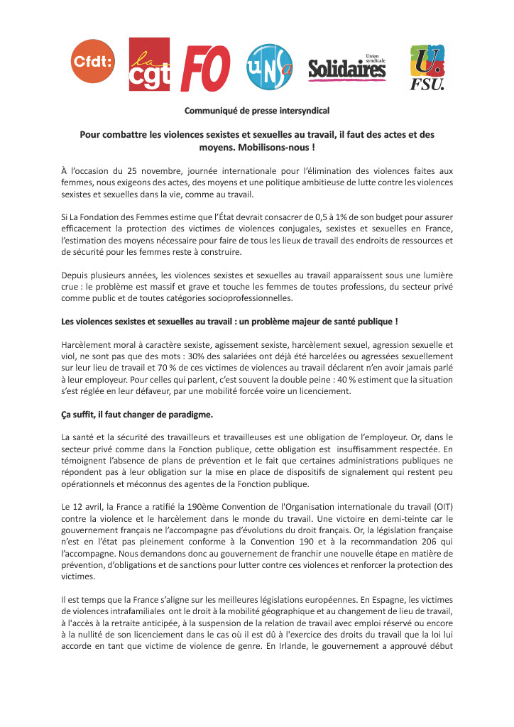 À l’occasion du 25 novembre, journée internationale pour l’élimination des violences faites aux femmes, nous exigeons des actes, des moyens et une politique ambitieuse de lutte contre les violences sexistes et sexuelles dans la vie, comme au travail.