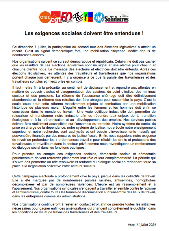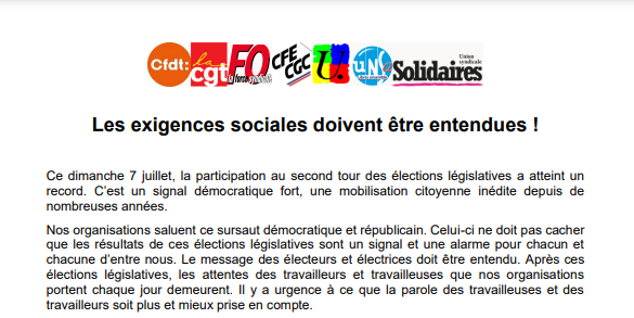 Nos organisations saluent ce sursaut démocratique et républicain. Celui-ci ne doit pas cacher que les résultats de ces élections législatives sont un signal et une alarme pour chacun et chacune d’entre nous. Le message des électeurs et électrices doit être entendu. Après ces élections législatives, les attentes des travailleurs et travailleuses que nos organisations portent chaque jour demeurent. Il y a urgence à ce que la parole des travailleuses et des travailleurs soit plus et mieux prise en compte.