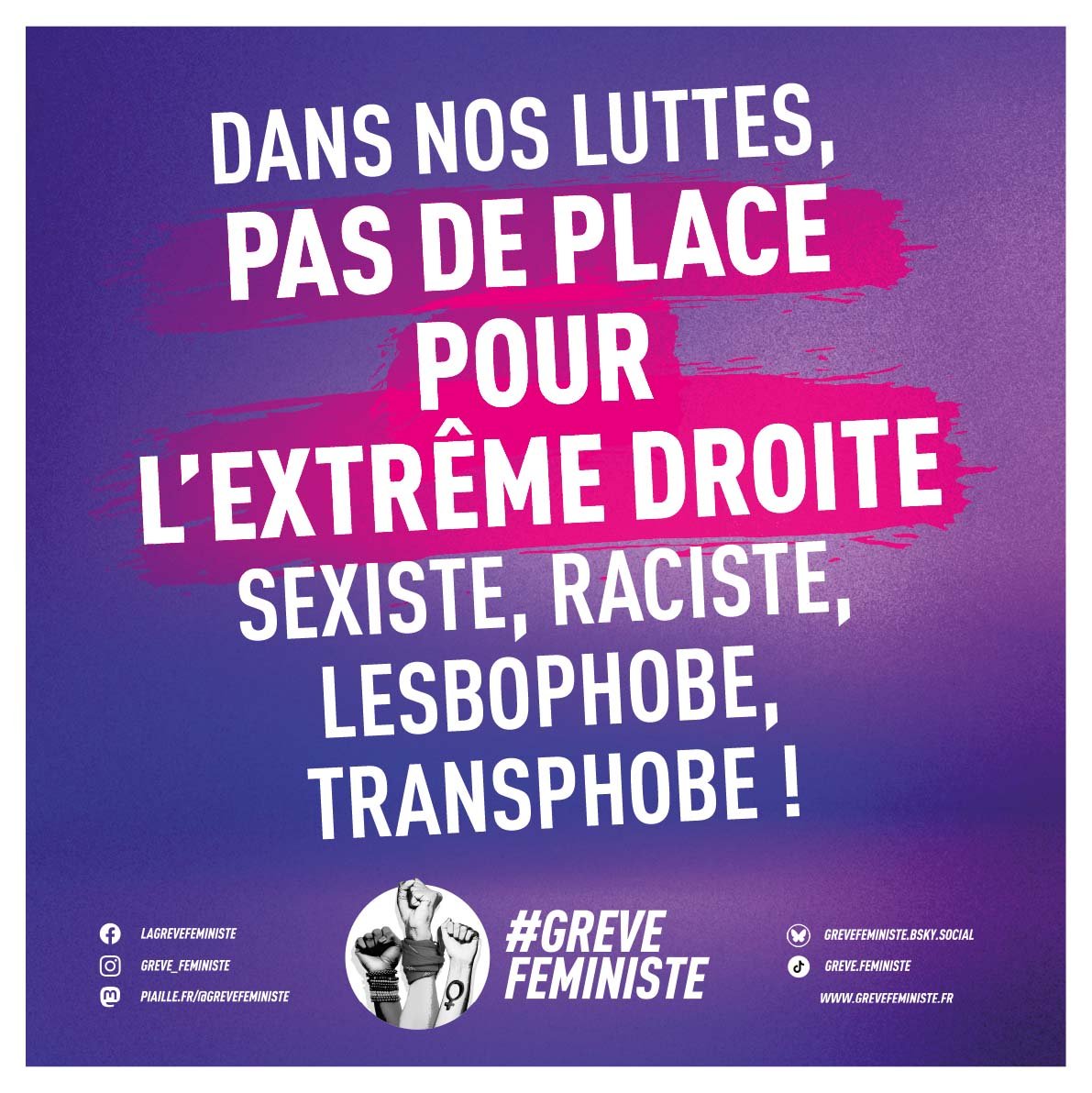 L’extrême droite, masculiniste, sexiste, raciste, lesbophobe et transphobe, constitue une menace majeure pour toutes les femmes et minorités, et n’a pas sa place dans nos cortèges. Elle ne se préoccupe des violences faites aux femmes que pour les instrumentaliser à des fins xénophobes et racistes. Nous savons toutes et tous que la majorité des violences ont lieu au sein de la famille ou perpétrés par des proches.