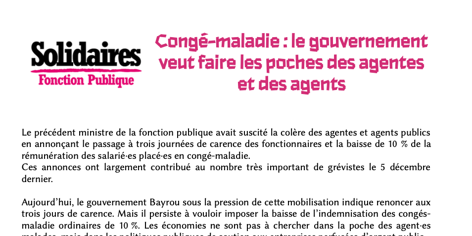 Aujourd’hui, le gouvernement Bayrou sous la pression de cette mobilisation indique renoncer aux trois jours de carence. Mais il persiste à vouloir imposer la baisse de l’indemnisation des congés-maladie ordinaires de 10%. Les économies ne sont pas à chercher dans la poche des agent·es malades, mais dans les politiques publiques de soutien aux entreprises perfusées d’argent public.