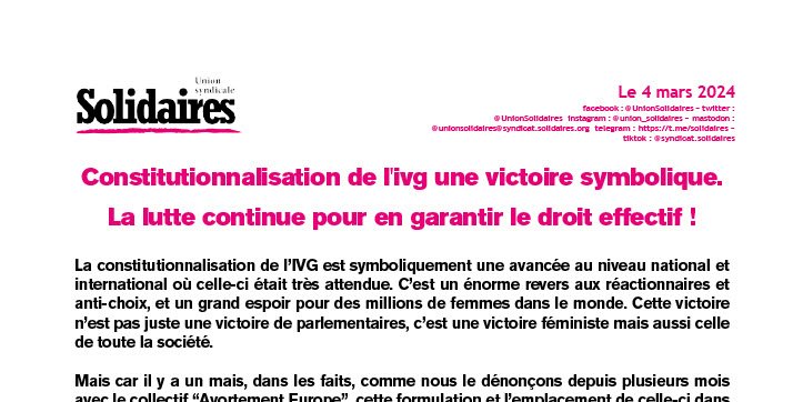 La constitutionnalisation de l’IVG est symboliquement une avancée au niveau national et international où celle-ci était très attendue. C’est un énorme revers aux réactionnaires et anti-choix, et un grand espoir pour des millions de femmes dans le monde. Cette victoire n’est pas juste une victoire de parlementaires, c’est une victoire féministe mais aussi celle de toute la société.