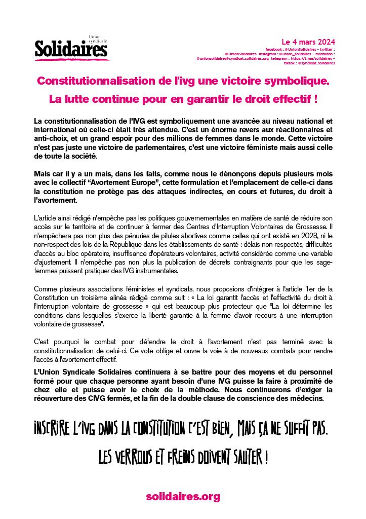 C’est pourquoi le combat pour défendre le droit à l’avortement n’est pas terminé avec la constitutionnalisation de celui-ci. Ce vote oblige et ouvre la voie à de nouveaux combats pour rendre l’accès à l’avortement effectif.