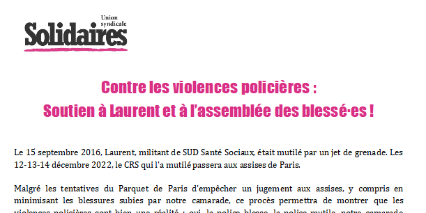 Le 15 septembre 2016, Laurent, militant de SUD Santé Sociaux, était mutilé par un jet de grenade. Les 12-13-14 décembre 2022, le CRS qui l'a mutilé passera aux assises de Paris.