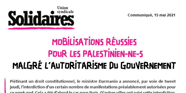 Solidaires soutient la lutte du peuple palestinien pour son droit à l'autodétermination. Nous continuerons à exprimer nos solidarités avec les Palestiniens et Palestiniennes dans notre syndicalisme internationaliste au quotidien et dans la rue !