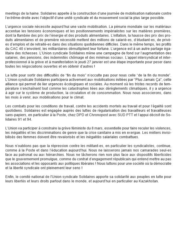 Enfin, le comité national de l'Union syndicale Solidaires apporte sa solidarité aux peuples en lutte pour leurs libertés et leurs droits partout dans le monde, et aujourd’hui en particulier au Kazakhstan