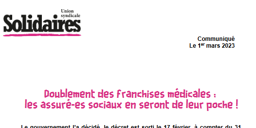 Le gouvernement l’a décidé, le décret est sorti le 17 février, à compter du 31 mars 2024 les franchises médicales sont doublées : l’assuré social devra payer de sa poche 1 euro par boite de médicament remboursée et par acte d’un auxiliaire médical (contre 50 centimes aujourd’hui) et 2 euros pour une consultation chez le médecin ou examen/analyse (contre 1 euro aujourd’hui), 4 euros par transport sanitaire ou taxi, le tout dans un plafond de 50 euros annuels.