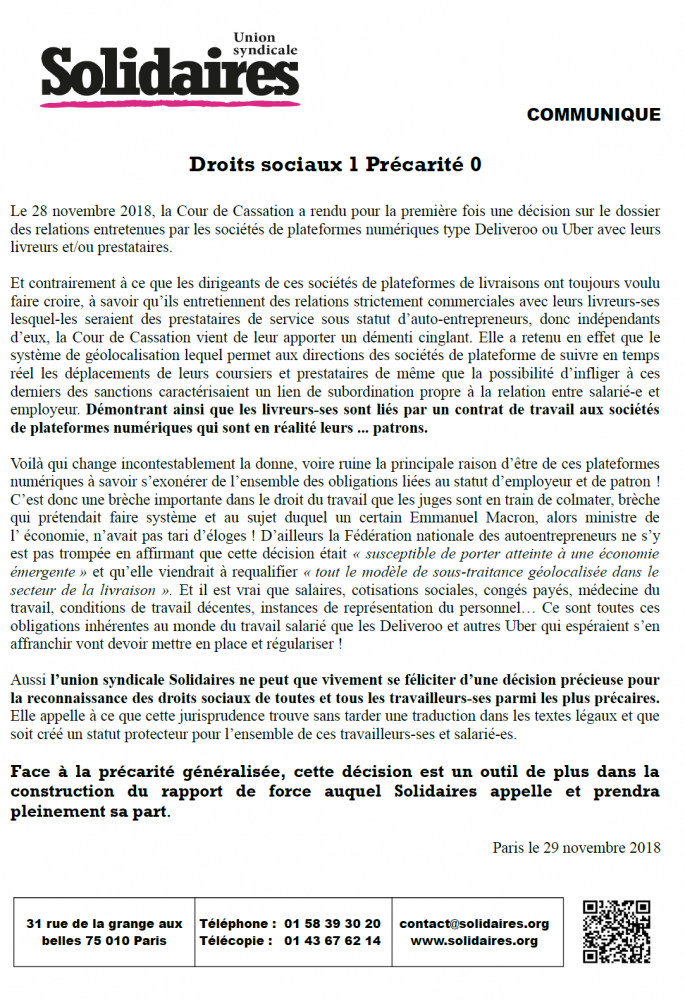 l’union syndicale Solidaires ne peut que vivement se féliciter d’une décision précieuse pour la reconnaissance des droits sociaux de toutes et tous les travailleurs-ses parmi les plus précaires.