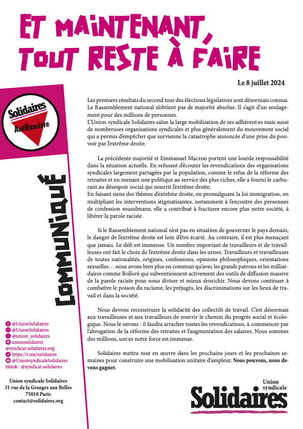 L’Union syndicale Solidaires salue la large mobilisation de ses adhérent·es mais aussi de nombreuses organisations syndicales et plus généralement du mouvement social qui a permis d’empêcher que survienne la catastrophe annoncée d’une prise du pouvoir par l’extrême droite.
