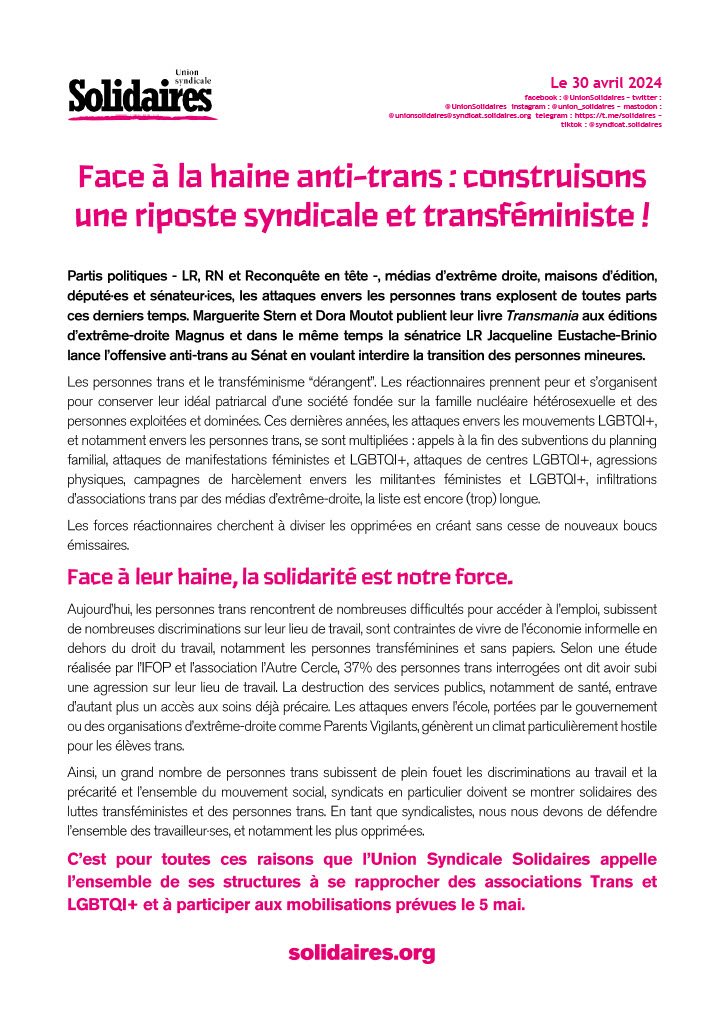 C’est pour toutes ces raisons que l’Union Syndicale Solidaires appelle l’ensemble de ses structures à se rapprocher des associations Trans et LGBTQI+ et à participer aux mobilisations prévues le 5 mai.