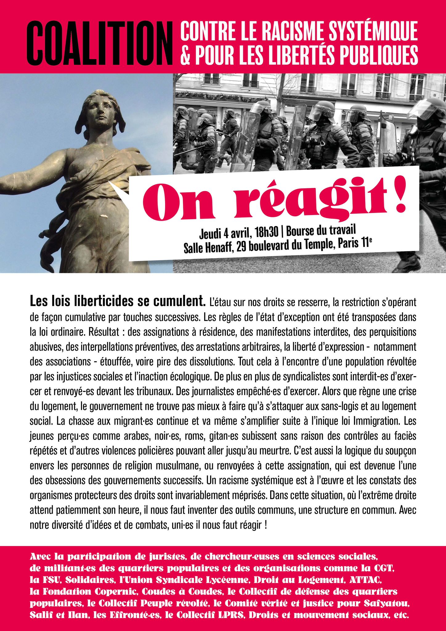 Face à la remise en cause permanente des libertés publiques, à la persistance d’un racisme systémique, une coalition regroupant des organisations syndicales, associatives, des collectifs militants des quartiers populaires ainsi que des juristes et chercheurs en sciences sociales s’est constituée. Attac participe à ce cadre. Une première initiative aura lieu jeudi 4 avril à 18h30 à la Bourse du travail, salle Henaff, 29 boulevard du Temple, Paris 11.