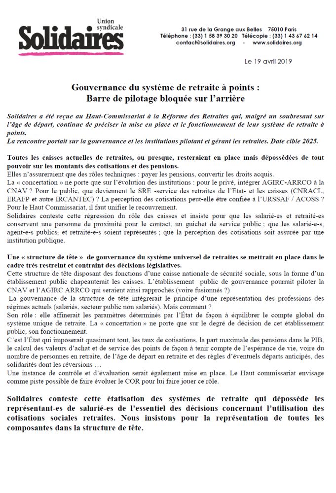 Communiqué et compte rendu sur la réforme des retraites sur la gouvernance