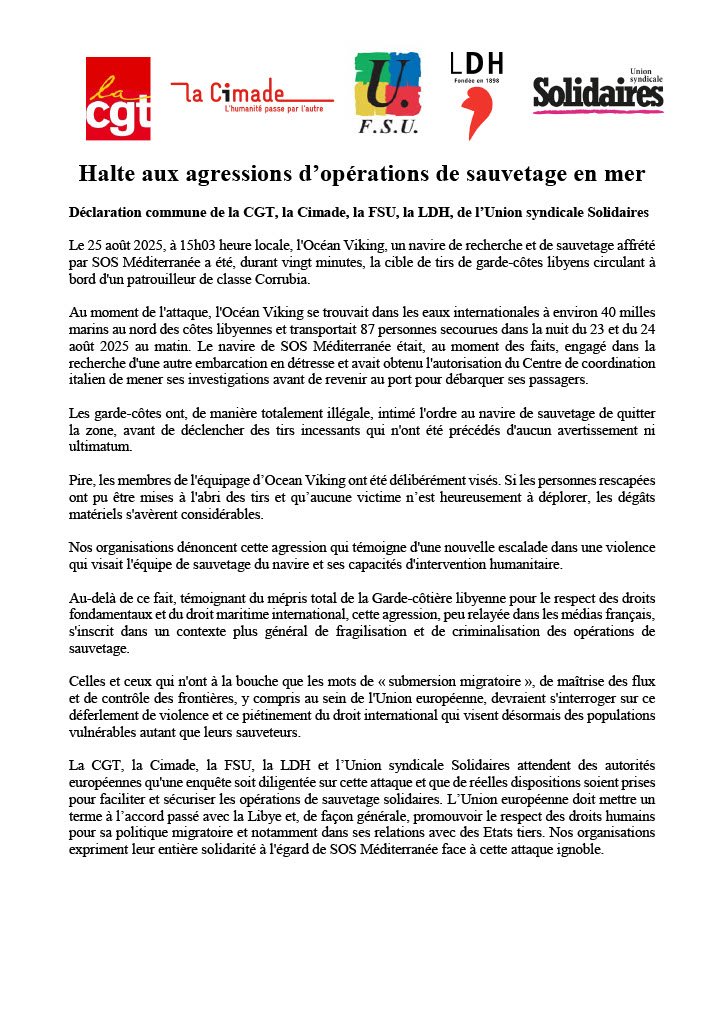 La CGT, la Cimade, la FSU, la LDH et l’Union syndicale Solidaires attendent des autorités européennes qu'une enquête soit diligentée sur cette attaque et que de réelles dispositions soient prises pour faciliter et sécuriser les opérations de sauvetage solidaires. L’Union européenne doit mettre un terme à l’accord passé avec la Libye et, de façon générale, promouvoir le respect des droits humains pour sa politique migratoire et notamment dans ses relations avec des Etats tiers.