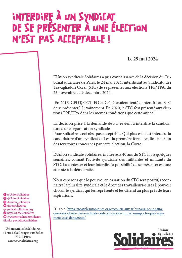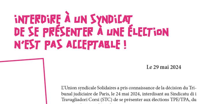 L'Union syndicale Solidaires a pris connaissance de la décision du Tribunal judiciaire de Paris, le 24 mai 2024, interdisant au Sindicatu di i Travagliadori Corsi (STC) de se présenter aux élections TPE/TPA, du 25 novembre au 9 décembre 2024.