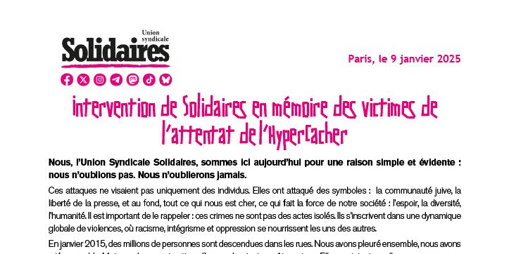 Nous, l’Union Syndicale Solidaires, sommes ici aujourd’hui pour une raison simple et évidente : nous n’oublions pas. Nous n’oublierons jamais.