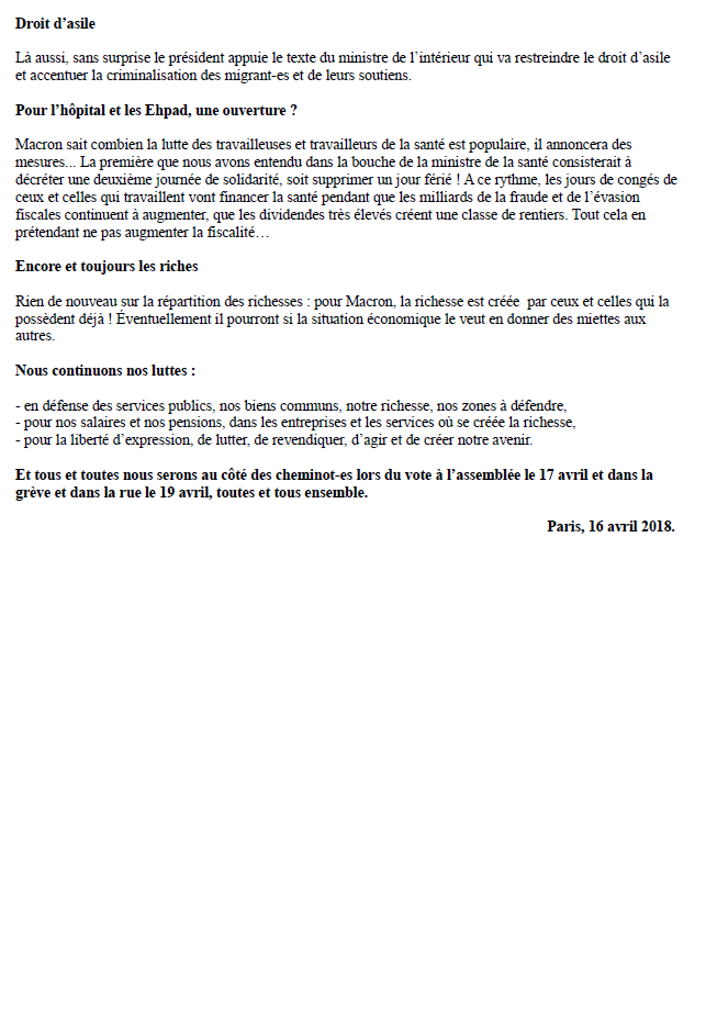 Et tous et toutes nous serons au côté des cheminot-es lors du vote à l’assemblée le 17 avril et dans la grève et dans la rue le 19 avril, toutes et tous ensemble.