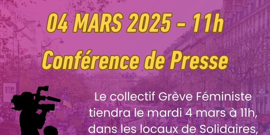 A la veille de ce 8 mars, nous vous invitons à une conférence de presse du collectif Grève Féministe qui aura lieu le mardi 4 mars à 11 heures au local de l’Union Syndicale Solidaires, 31 rue de la Grange aux Belles, 75010 Paris.