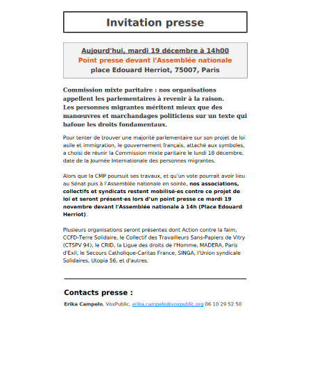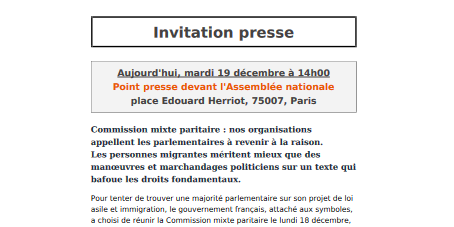 Alors que la CMP poursuit ses travaux, et qu’un vote pourrait avoir lieu au Sénat puis à l’Assemblée nationale en soirée, nos associations, collectifs et syndicats restent mobilisé·es contre ce projet de loi et seront présent·es lors d’un point presse ce mardi 19 novembre devant l'Assemblée nationale à 14h (Place Edouard Herriot).