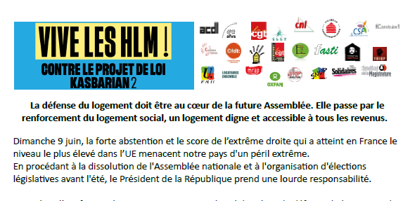 La dissolution de l’Assemblée Nationale a ajourné le projet de loi Kasbarian 2 contre lequel les acteurs du secteur HLM se sont très majoritairement opposés. Le gouvernement doit signifier l’abandon définitif de ce texte d’exclusion sociale.