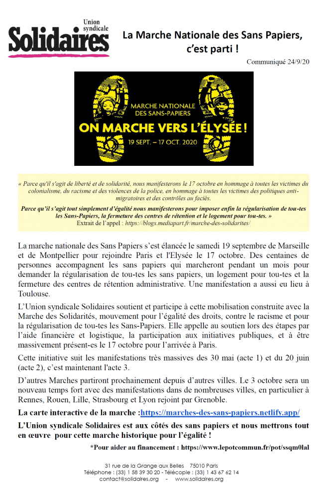 L’Union syndicale Solidaires soutient et participe à cette mobilisation construite avec la Marche des Solidarités, mouvement pour l’égalité des droits, contre le racisme et pour la régularisation de tou-tes les Sans-Papiers. Elle appelle au soutien lors des étapes par l’aide financière et logistique, la participation aux initiatives publiques, et à être massivement présent-es le 17 octobre pour l’arrivée à Paris.