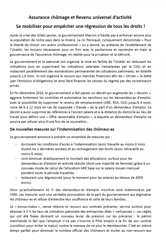 Tract unitaire "Assurance chômage et Revenu universel d’activité : Se mobiliser pour empêcher une régression de tous les droits !"