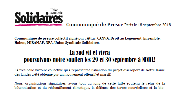 Face au gouvernement et au nouveau Copil, nous appelons nos Adhérents / sympathisants… à participer massivement au rassemblement « Terres Communes » des 29 et 30 septembre sur la zad de Notre-Dame-des-Landes.