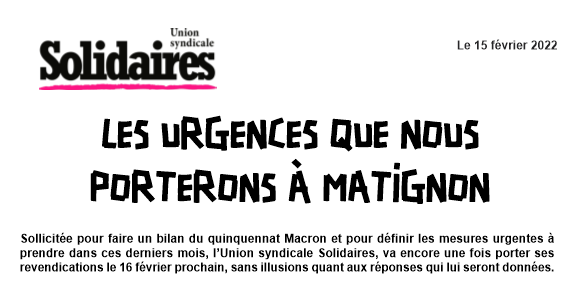 Sollicitée pour faire un bilan du quinquennat Macron et pour définir les mesures urgentes à prendre dans ces derniers mois, l’Union syndicale Solidaires, va encore une fois porter ses revendications le 16 février prochain, sans illusions quant aux réponses qui lui seront données.